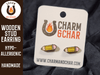 Earrings are made from 3mm wood and are approximately 0.5 inches to 0.6 inches high. The posts are made from hypoallergenic stainless steel. If you do not see a color you like feel free to request a customization!!