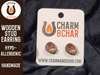 Earrings are made from 3mm wood and are approximately 0.5 inches to 0.6 inches high. The posts are made from hypoallergenic stainless steel. If you do not see a color you like feel free to request a customization!!