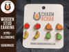 Earrings are made from 3mm wood and are approximately 0.5 inches to 0.6 inches high. The posts are made from hypoallergenic stainless steel. If you do not see a color you like feel free to request a customization!!