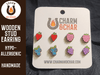 Earrings are made from 3mm wood and are approximately 0.5 inches to 0.6 inches high. The posts are made from hypoallergenic stainless steel. If you do not see a color you like feel free to request a customization!!