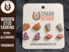 Earrings are made from 3mm wood and are approximately 0.5 inches to 0.6 inches high. The posts are made from hypoallergenic stainless steel. If you do not see a color you like feel free to request a customization!!