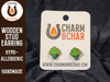 Earrings are made from 3mm wood and are approximately 0.5 inches to 0.6 inches high. The posts are made from hypoallergenic stainless steel. If you do not see a color you like feel free to request a customization!!
